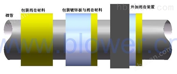 针对罗茨鼓风机外面加上隔声罩后外接管道辐射出的噪音对周围环境造成声污染的场合。可以根据不同的应用行业工况,采用不同的降噪方案,如:1.管道只包覆吸音层;2.管道只加消声箱;3.管道包覆吸音层和加装消声箱,单独设计达到降噪的目的。